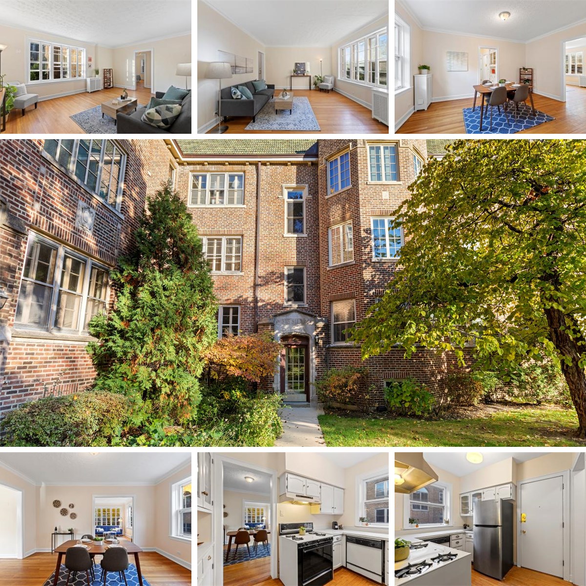 Rarely available and highly sought after 2 bedroom plus den, 1 bathroom condo with exterior parking included, private and quietly situated in courtyard setting behind Central Street at The Sissilla and ready for its new owners. Inviting and foyer entry with large coat closet. Hardwood floors throughout. Spacious living room with large windows overlooking Canal Shores golf course with treetop views - a breath of fresh air in this urban setting. Large separate dining room perfect for entertaining. Cozy kitchen is ready for your personal touches. Amazing bonus space: den flooded with light from the multiple walls of windows. Primary bedroom with large closet. Second bedroom also spacious with a good-sized closet. Shared hall bath with tub/shower. This unit is only one of three that has its own dedicated parking space. Storage and Laundry located in the basement. Great location with easy to walk to restaurants, bakery, shops, the Metra, and the Purple Line L. Make this your home now!